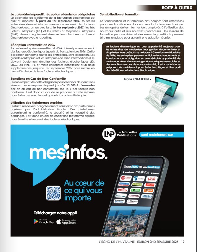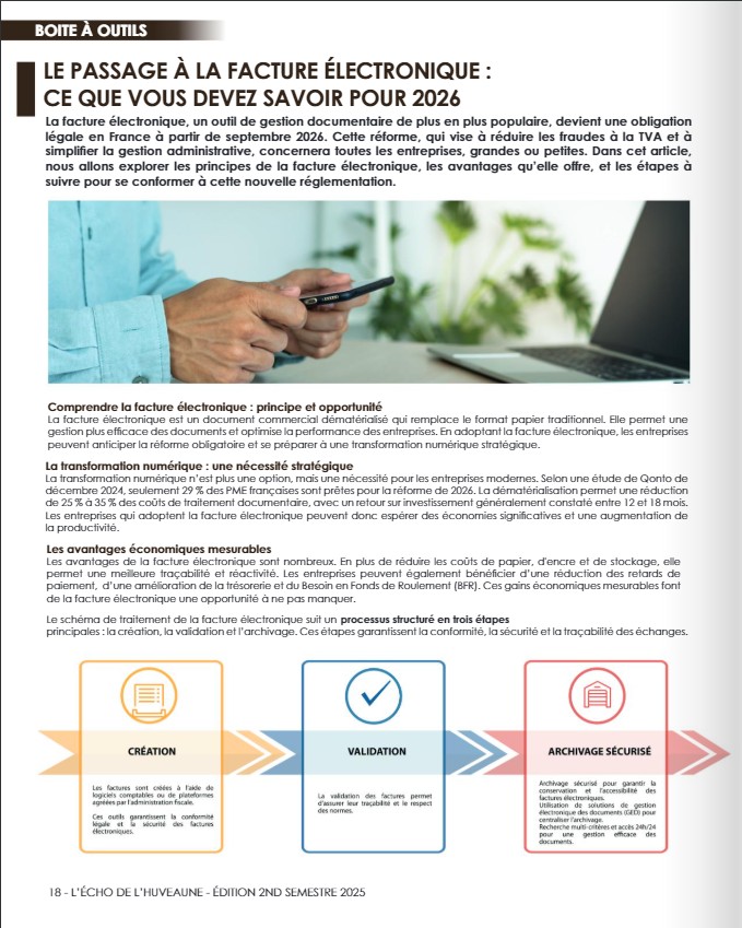Nous avons eu le plaisir de signer un article dans le dernier magazine de l’association des Entrepreneurs de l’Huveaune Vallée, sur la transition vers la facture électronique, afin de vous aider à transformer cette obligation réglementaire en un véritable levier de performance pour votre gestion.